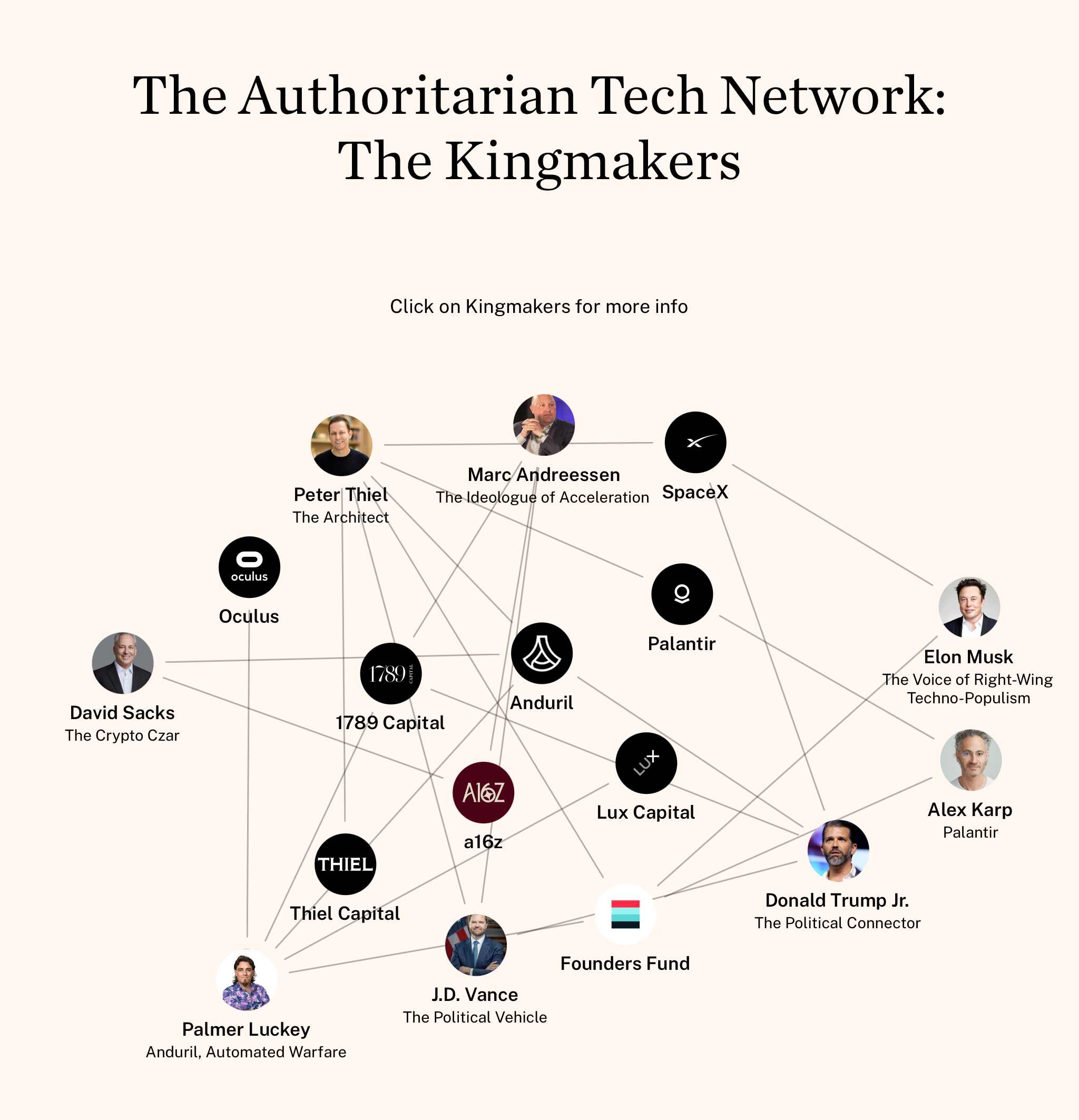 Auf der englischsprachigen Webseite authoritarian-stack.info zeigen Wissenschaftler:innen jetzt die personellen und finanziellen Verbindungen hinter dem «Authoritarian Stack» auf – und warnen davor, das Modell nach Europa zu exportieren. Das Projekt kartiert mit interaktiven Grafiken ein Netzwerk aus Unternehmen, Fonds und politischen Akteuren, die zentrale staatliche Funktionen in private Plattformen umwandeln. Es basiert auf einem Open-Source-Datensatz mit über 250 Akteuren, Tausenden von verifizierten Verbindungen und dokumentierten Finanzströmen in Höhe von 45 Milliarden US-Dollar.